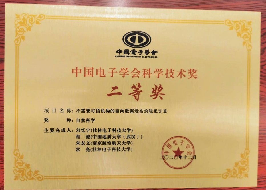 (通讯员:章丽平)2021年4月17-18日,中国电子学会2020年度科学技术奖励大会在重庆举行。1946伟德国际源自英国信息安全系程池老师与桂林电子科技大学、南京航空航天大学的学者共同完成的“不需要可信机构的面向数据发布的隐私计算”荣获2020年度中国电子学会科学技术奖自然科学二等奖。郝跃院士、刘明院士等23位院士出席大会并颁奖。