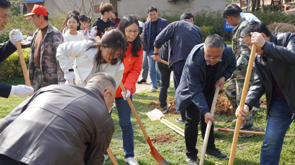活动中,企业和师生代表分成3组植树小分队,挥锹铲土、挖坑扶苗、填土浇水、植树灌溉。现场红旗飘飘,大家热情洋溢、干劲十足,以饱满的热情投入到播种绿色的行动中。党员同志们撸起袖子,扑下身子拿起锹,扶正树苗、培实树根,浇水灌溉,互相配合,一派热火朝天的劳动场面。