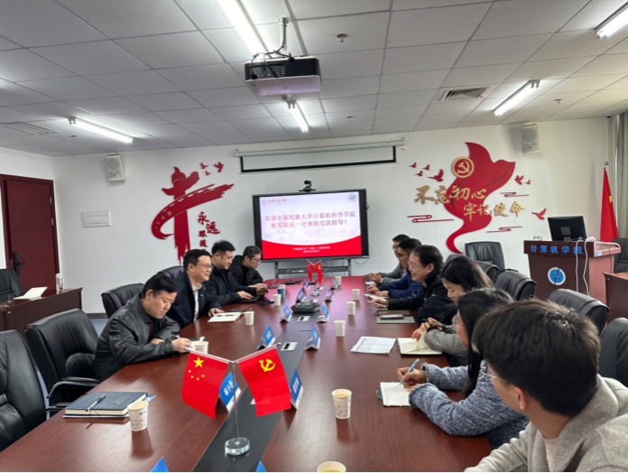 3月26日上午,中南民族大学计算机科学学院院长帖军、党委副书记王魏芳,携计算机科学与技术系主任徐胜舟、人工智能系主任康怡琳、软件工程系主任彭川、党建工作联络员沈易军等一行6人来我院交流。学院党委书记李国昌、院长张洪艳、党委副书记林小艳、副院长陈云亮、计算机科学与技术系主任熊慕舟、软件工程系主任李圣文、智能科学与技术系副主任姜三等同志参与交流研讨。张洪艳院长主持会议。