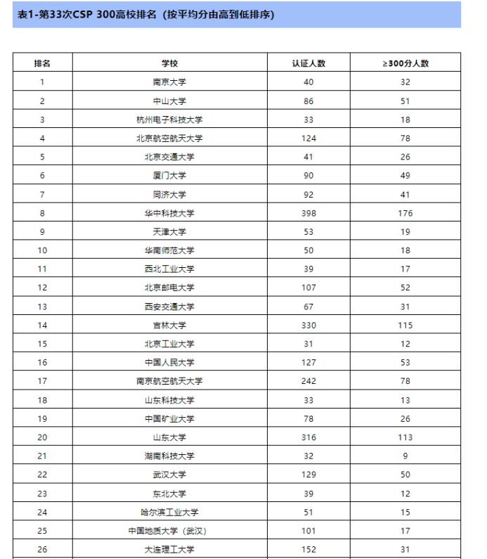 2024年3月31日,第33次CCF CSP认证考试成功举行。我院学子取得CSP 300高校排名第25位,CSP TOP30高校排名第29位的优异成绩!