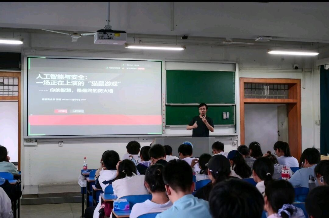 许瑞老师以“猫鼠游戏”为喻,生动阐述了人工智能与网络信息安全间的动态博弈关系。AI在此博弈中呈现双重属性:一方面,它是高效的“防御之盾”,通过强大的模式识别能力,在海量流量中精准预警并拦截攻击;另一方面,亦可化为犀利的“攻击之矛”,被用于生成虚假信息、发动自动化攻击,使安全环境更趋复杂。许老师通过案例深入浅出地解析了当前攻防技术前沿。报告最终升华主题,强调在这场技术驱动的较量中,人的智慧始终是构建最终防线的根本基石。